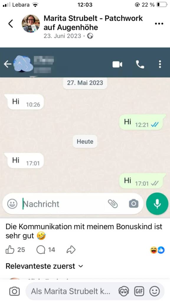 Ich weiß, dass es sich manchmal blöd anfühlt, immer diejenige sein zu müssen, die den ersten Schritt geht. Vor allem, wenn man sich schon mehrmals die Nase blutig gehauen hat, weil man eine patzige oder schlicht gar keine Antwort bekommt. Gerade hier hilft das Wissen, dass dein Bonuskind die beste Strategie wählt, die ihm oder ihr in dem Augenblick zur Verfügung steht. Wenn sie eine bessere hätte, würde sie die nehmen!